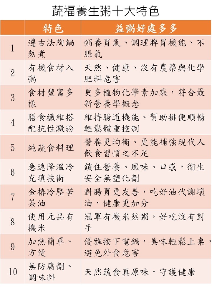 - 以有機蔬果、紅藜麥、糙米、黑糯米、紅糙米等取代大部分白米,熱量減半,營養加分。對血糖控制患者友善,是最天然健康的養生粥品