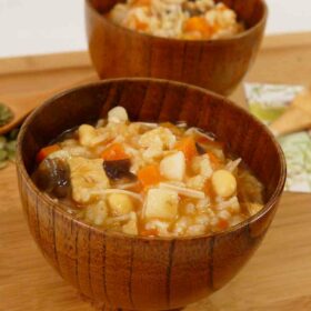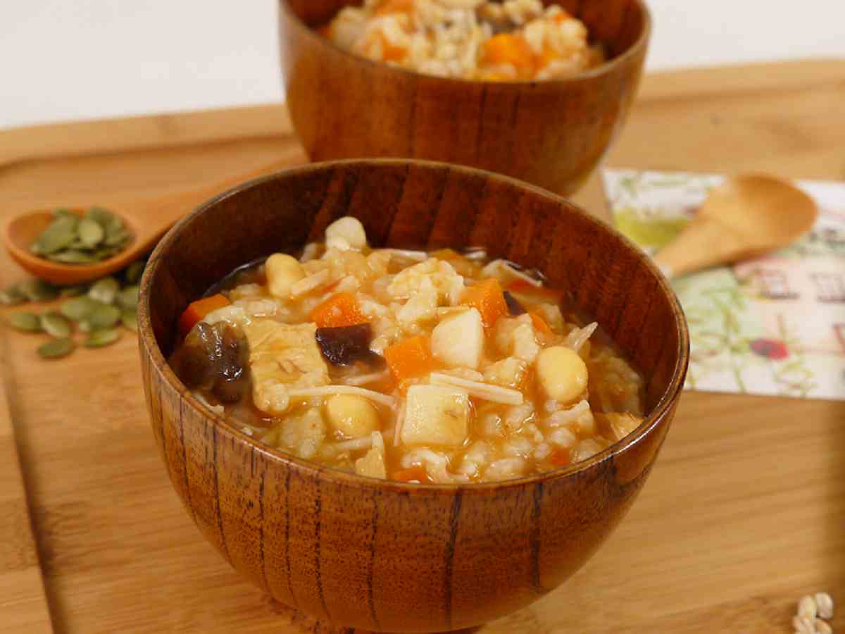 以有機紅蘿蔔、馬鈴薯、番茄、金針菇、腐竹、黑木耳等食材,搭配冷壓苦茶油、黑糯米、紅糙米、秈糙米、梗米等細火燉煮成男女老少都無法抗拒的酸鮮好滋味,多種健康食材相輔加乘,更是您與家人不可錯過養生好粥。
